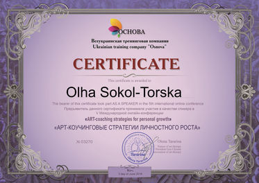 Certyfikowany coach, lingvocoach, psycholog, terapeuta sztuki, członek Wschodnio-Ukraińskiego Stowarzyszenia Terapii Artystycznej, pisarz, poeta, tłumacz, poliglota, magister filologii ukraińskiej oraz polskiej, skończyłam studia z wyróżnieniem. Uczę Polaków ukraińskiego i Ukraińców polskiego języka. Mieszkam w Warszawie, urodziłam się blisko Lwowa, jestem Ukrainką, która kocha ludzi, jest otwarta na świat, piszę wiersze, układam swoje piosenki, śpiewam je, piszę prozę, prowadzę konsultacje, dotyczące nauki polskiego oraz pomagam za pomocą pytań usłyszeć głos własnej duszy, a nie umysłu